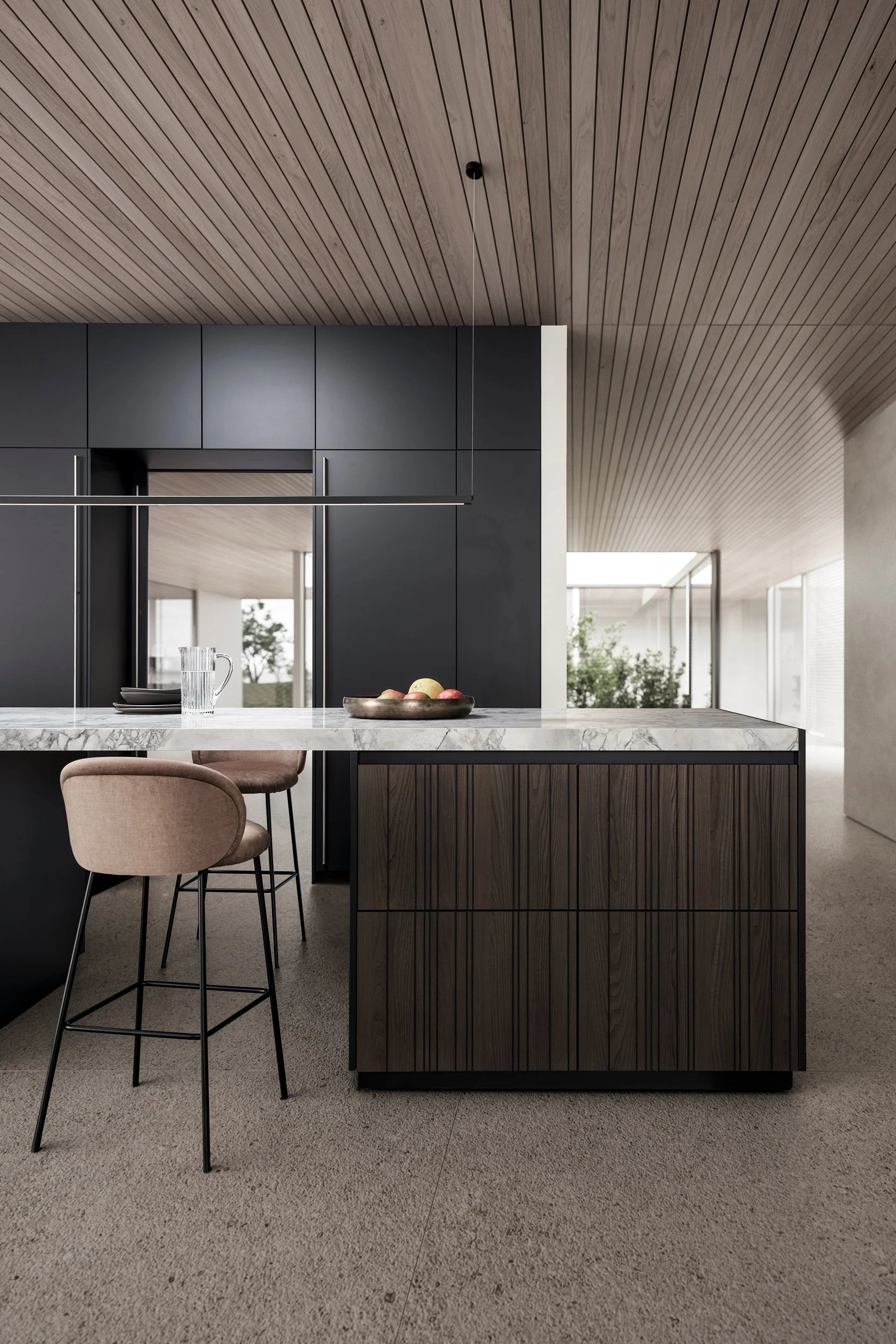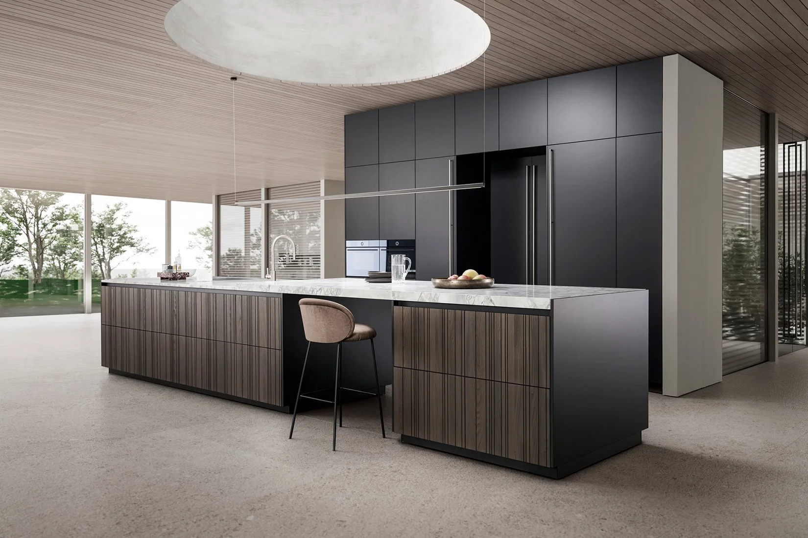 The contrast of the dark vertical grooves combined with the equally black edge details gives the BAHIA product a confident and timeless appearance. BAHIA is an expression of naturalness, vitality, atmosphere, and value. In line with this, the veneer finishes were chosen in dark and impactful surfaces: available options include elm, ash, and walnut.