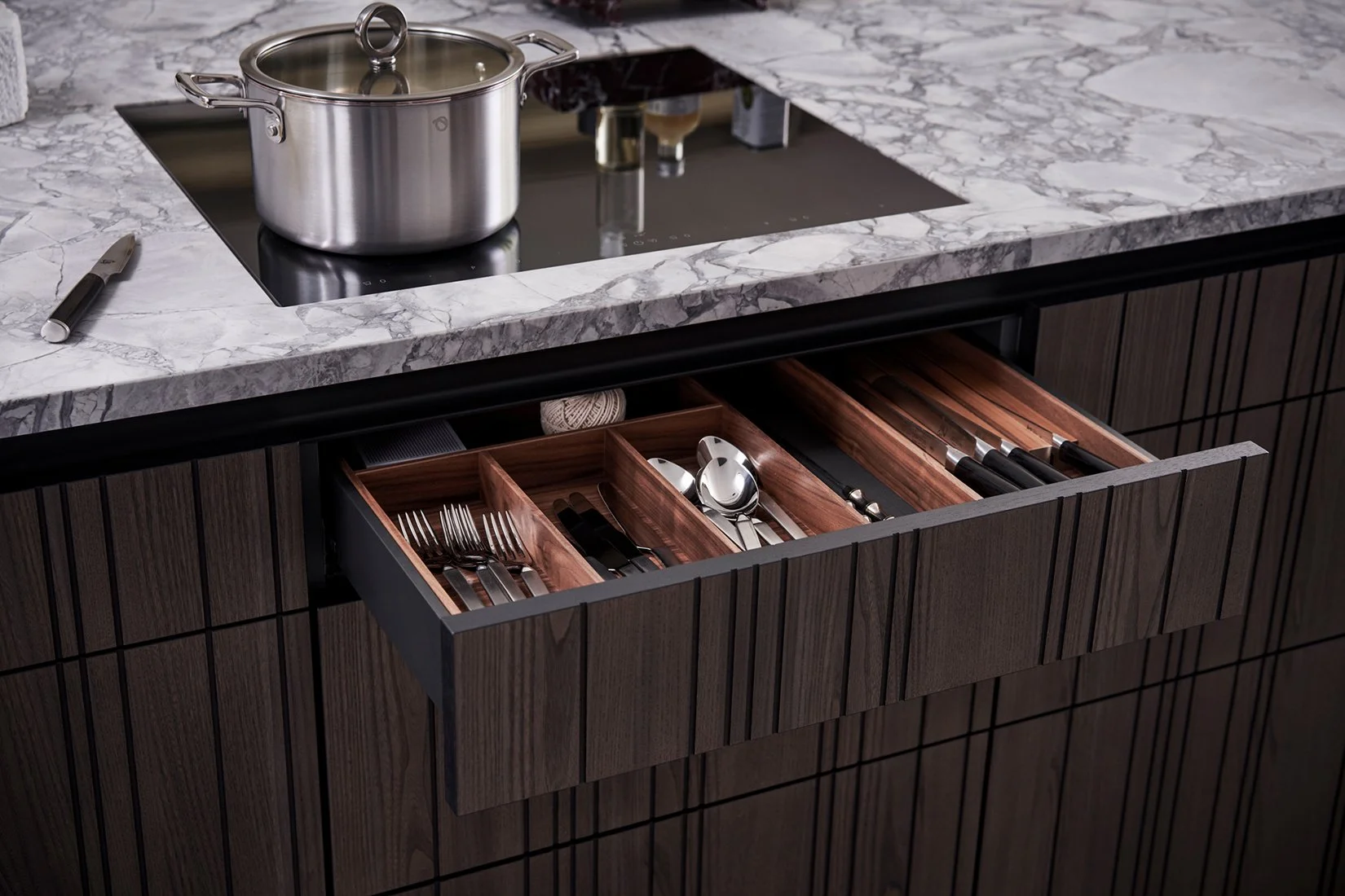 The individual cabinets visually merge into a single piece of furniture. This special feature is created by keeping the visible vertical grooves dark and executing them in the width of the classic vertical joint. This makes the grooves appear visually like a joint, or the joint appears like a groove – a perfect camouflage.