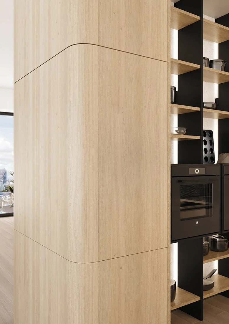 The generous 15 cm version with double curvature creates smooth transitions and a harmonious, symmetrical flow. Ideal for design concepts where form and aesthetics are in focus. The double-rounded panels lend furniture a particularly soft and inviting look – perfect for open-plan living and kitchen spaces.