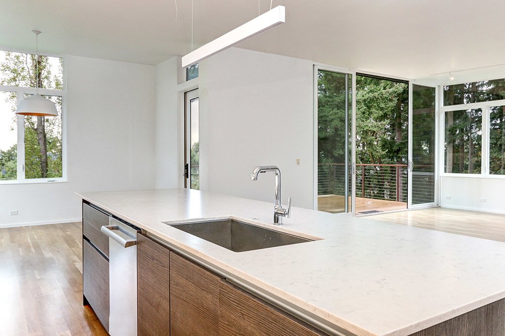 A mid-century inspired single custom family home in Bellevue, dark outside and bright inside. Living space on the upper floor with western views, allows high ceiling and much light through tall windows and skylight to brighten up kitchen and living room.